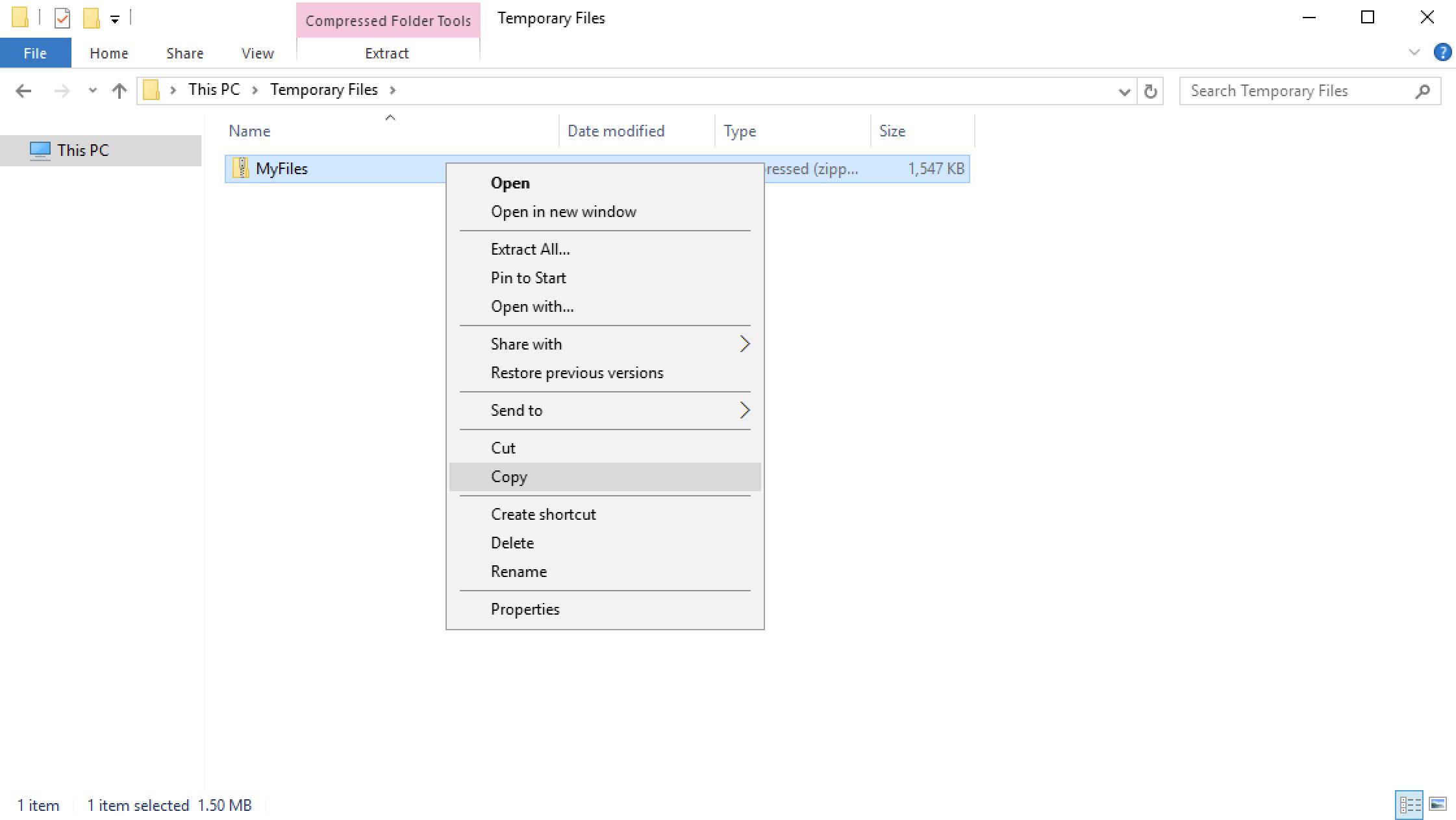 Open the File Explorer and find your uploaded zipped folder in the ‘Temporary Files’ folder. Once you’ve found it, right-click the zipped folder and click ‘Copy’.