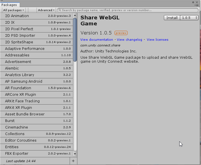 2. Package Manager ウィンドウで、WebGL Publisher パッケージを見つけます(左側のリストをスクロールするか、検索バーで検索します)。 このパッケージは以前「Share WebGL Game」と呼ばれていました(スクリーンショットにあるように)。このパッケージの Version 1.2 を必ずインストールしてください。