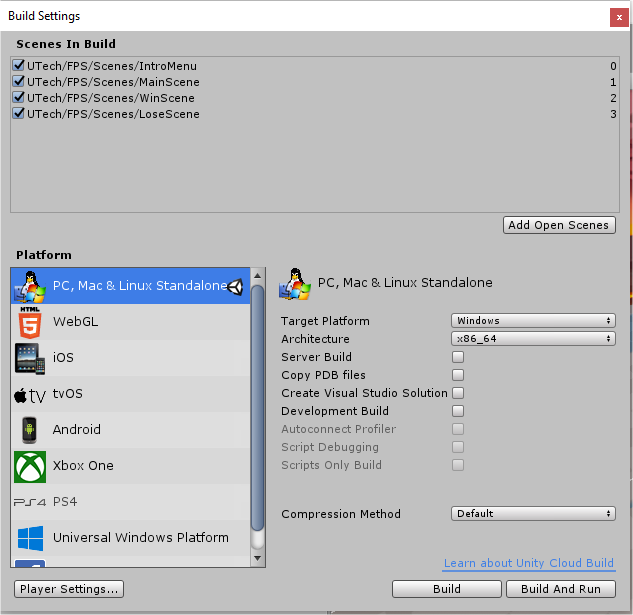 - これで、上の #4 から始めることができます。#4 の注意:すでに 「Add Open Scenes」をクリックしているので、Build Settings ウィンドウの「Scenes In Build」セクションのシーン名の隣にあるボックスに √ チェックを入れるだけです