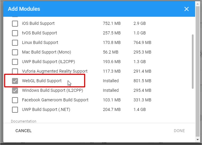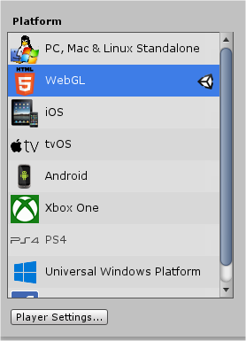 - Platforms > Done のリストから WebGL Build Support を選択します