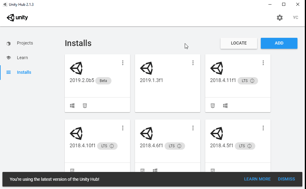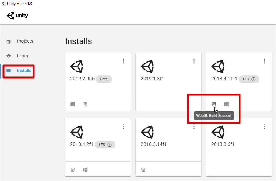 モジュールがインストールされているかどうかを確認するには、Unity Hub を起動し、Installs タブを選択します。