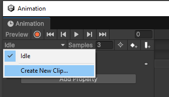 1. In the Animation window, with your PlayerCharacter GameObject still selected, open the Idle dropdown and select Create New Clip….