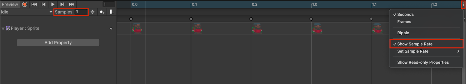 8. Open the More (⋮) menu next to the timeline and select Show Sample Rate, then change the Samples property on the left to roughly half of you number of frames (in our examples three).