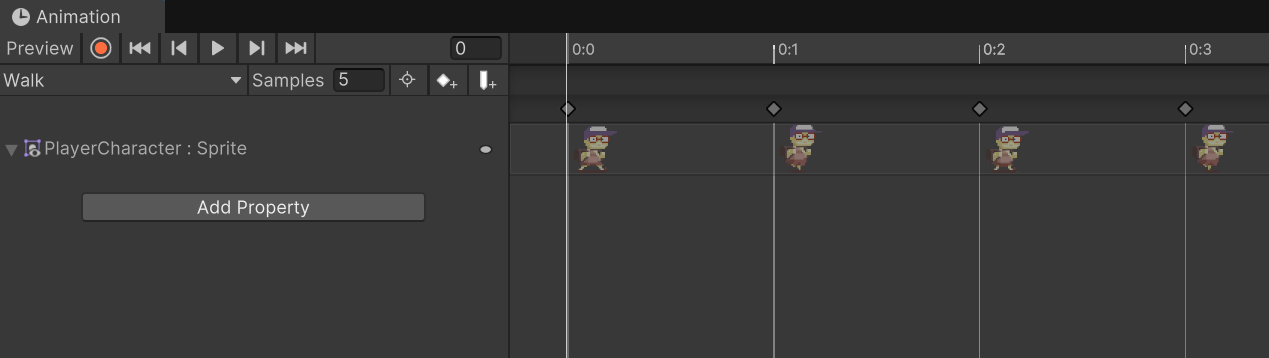 3. From the Sprites folder in the Project window, drag and drop the walking animation sprites into the timeline of the Animator window and edit the frame position or frame rate to make it look pleasing to you.