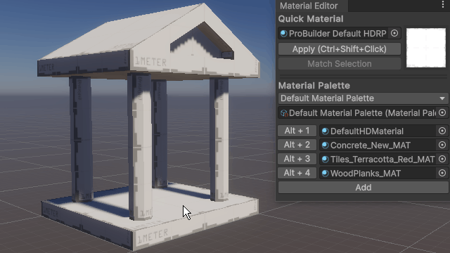Select a face and press the shortcut key of the material you want in the Material Editor to apply it. At this time, the tiling of the texture will be arranged automatically based on the UV Editor window. If after changing the tiling, rotation, etc., the material does not fit properly, refer to Editing UV in the scene, the fourth part of the UV Map settings tutorials, and quickly edit them directly in the Scene view.