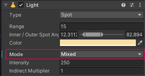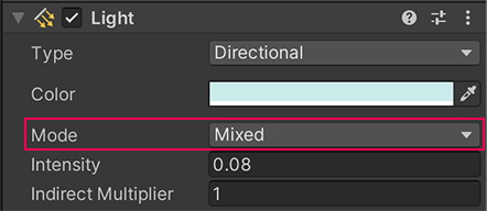 2. In the Inspector, find the Mode property in the Light component.