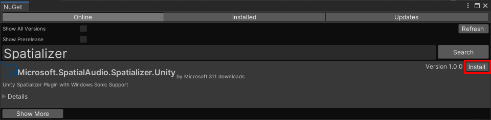 7. In the Search bar, type Spatializer. Click Install in the upper-right corner of the entry for Microsoft.SpatialAudio.Spatializer.Unity (Figure 05).