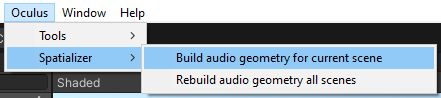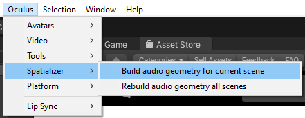 4. When you’ve attached the ONSP Propagation Geometry component to all participating Meshes and Terrains, you’re ready to build the audio geometry for your Scene(s) by using the Oculus drop-down to select either option from the Spatializer submenu (Figures 14-15).