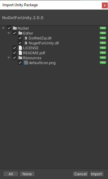 4. You can also double-click on the downloaded NuGet.unitypackage with Unity open to install.