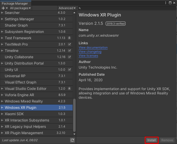 2. In the left column, click Windows XR Plugin. Click Install in the lower-right corner (Figure 01).