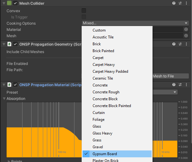 5. This attaches an ONSP Propagation Material component to each GameObject with the ONSP Propagation Geometry component, allowing you to assign a physical material preset, or define a custom material to alter sound in the virtual environment (Figure 16).