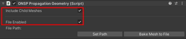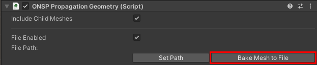 6. Each time the menu (from Step 4) is used to bake audio geometry, another ONSP Propagation Material component is added to all applicable GameObjects. Instead of baking all the Scene geometry again, you can bake newly-added geometry by clicking Bake Mesh to File in the Inspector (Figure 17).