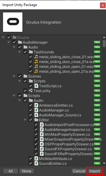 4. Click Import in the lower-right corner to import the Oculus Integration Package (Figure 08).