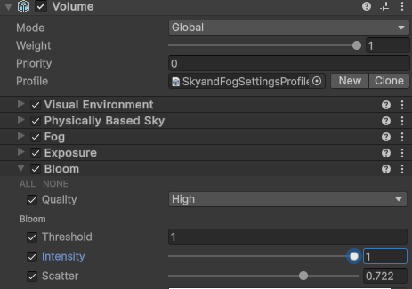 Add the Bloom effect and adjust the threshold and intensity.