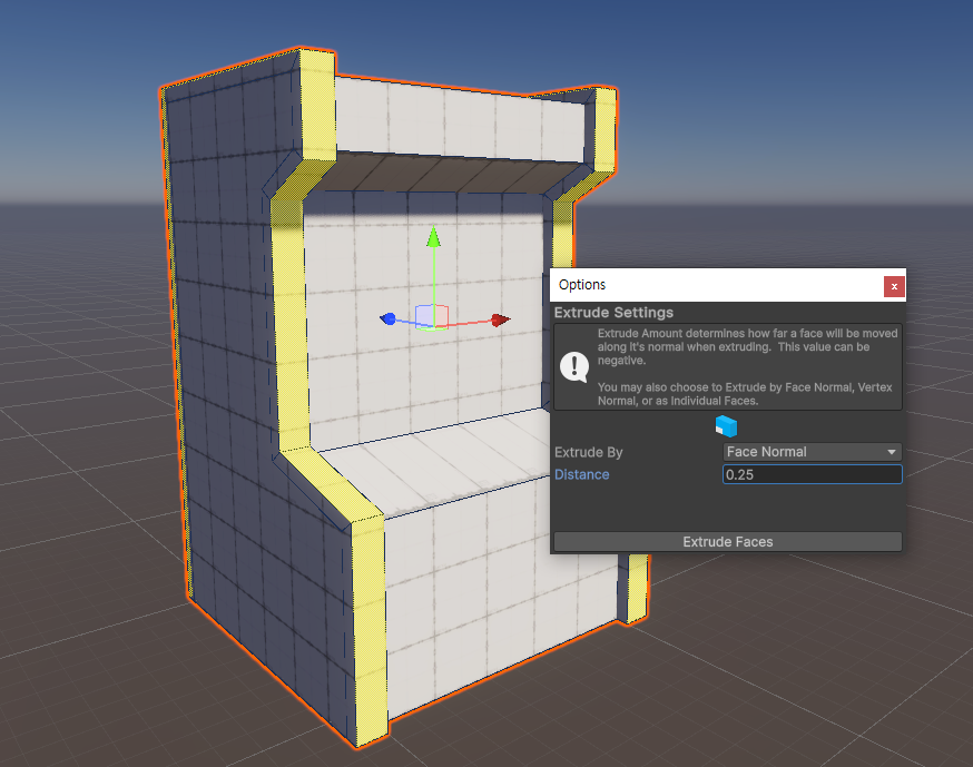 The sides of an arcade machine usually protrude. Select the left and right sides and use the Extrude Face tool to add a new bordered surface.