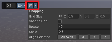 By default, the Snap tool is disabled. To enable it, select the Toggle Grid Snapping icon, then move your cursor over the Scene view to check that it's enabled. You’ll see the yellow square that follows your cursor snap to the vertices of the grid in the Scene view.