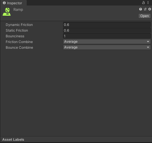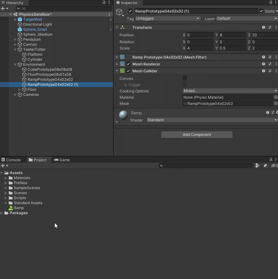 8. Apply the physics material to the ramp GameObject’s MeshCollider component.