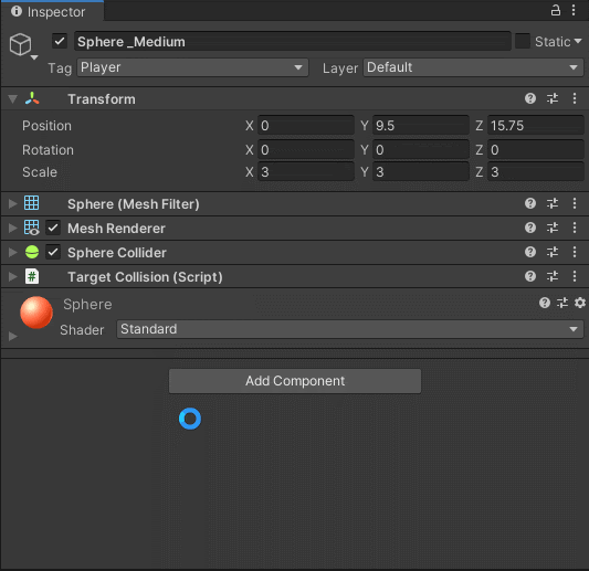 4. Select the Sphere_Medium GameObject and in the Inspector click Add Component, search for and Select the RigidBody component. Increase the mass to 10.