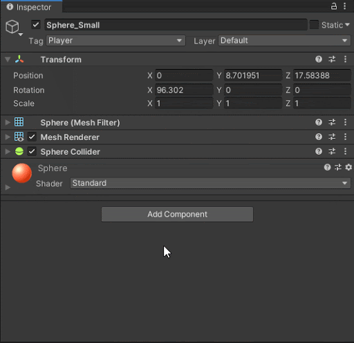 2. Select the Sphere_Small GameObject and in the Inspector click Add Component, search for and select the RigidBody component.