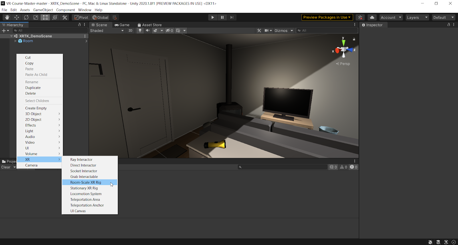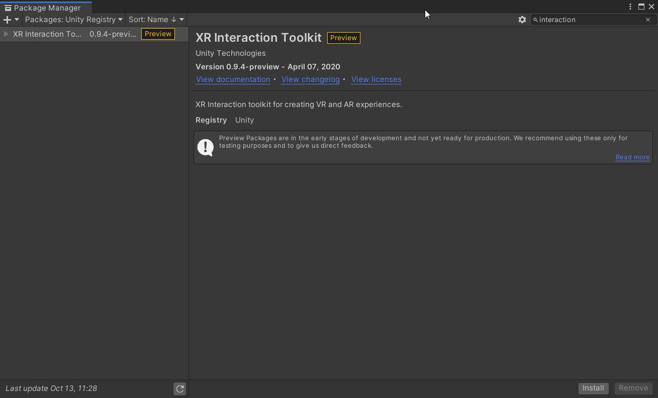 2. Download XR Interaction Toolkit from the preview package in the Package Manager. In the Packages folder, you now have the scripts and prefabs to use for the rest of the functionality.