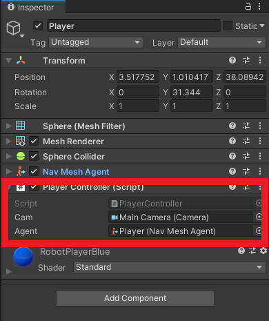 4. Back in the Unity Editor add your newly created PlayerController to the Player GameObject and configure the Serialized Values