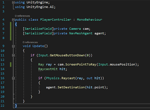 3. Add the following logic to the script so that mouse clicks update the Agent’s target position