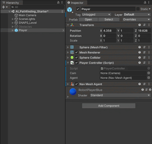 - Configure a NavMesh Agent to move around the scene’s NavMeshes