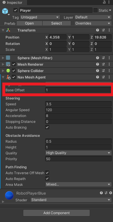 1. Select the Player GameObject in the Scene and in the Inspector add the NavMeshAgent Component and set the Base Offset value to 1 to compensate for the gap between the floor and the bottom of the Player’s mesh.