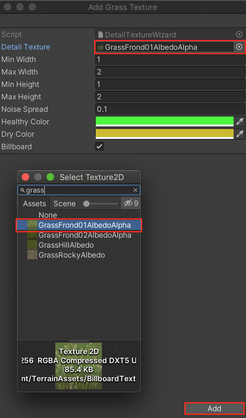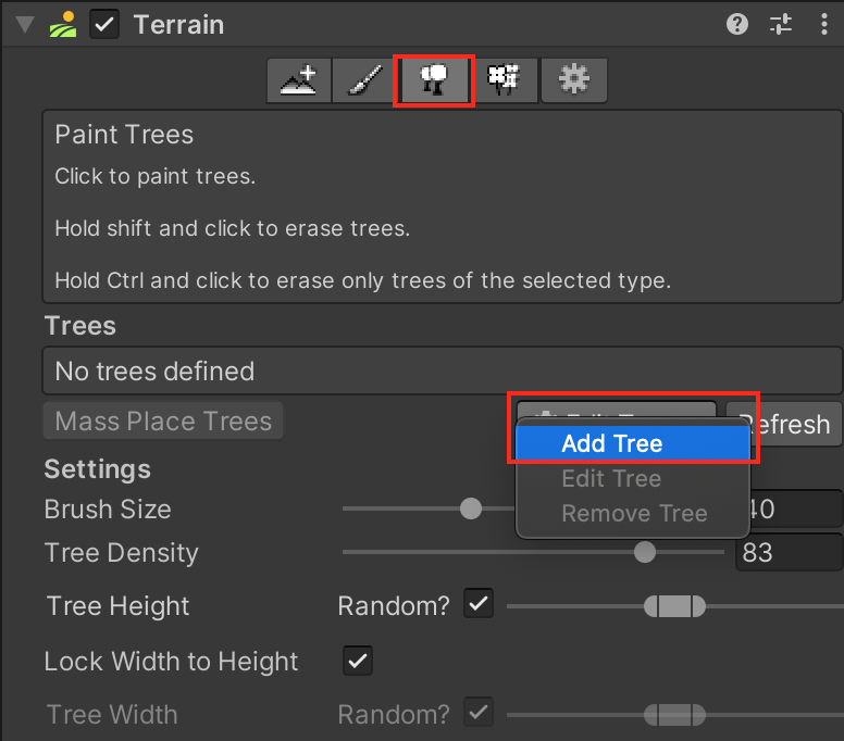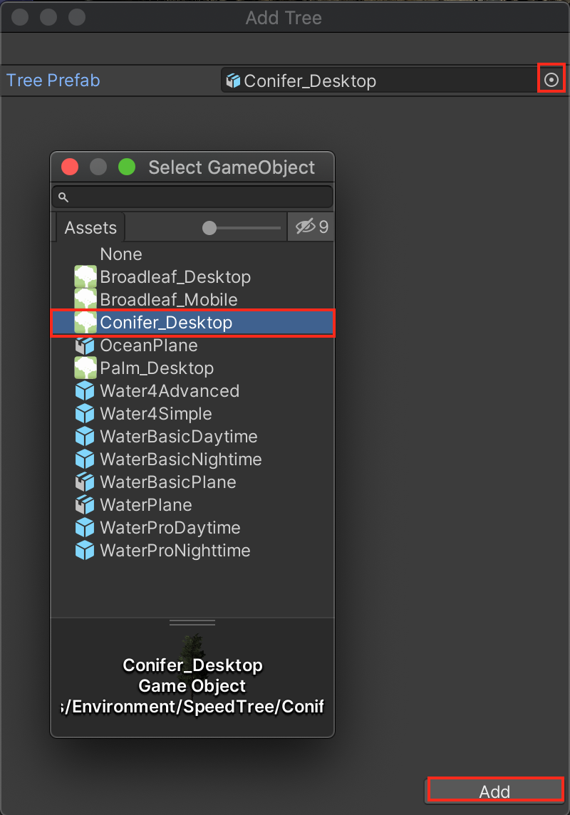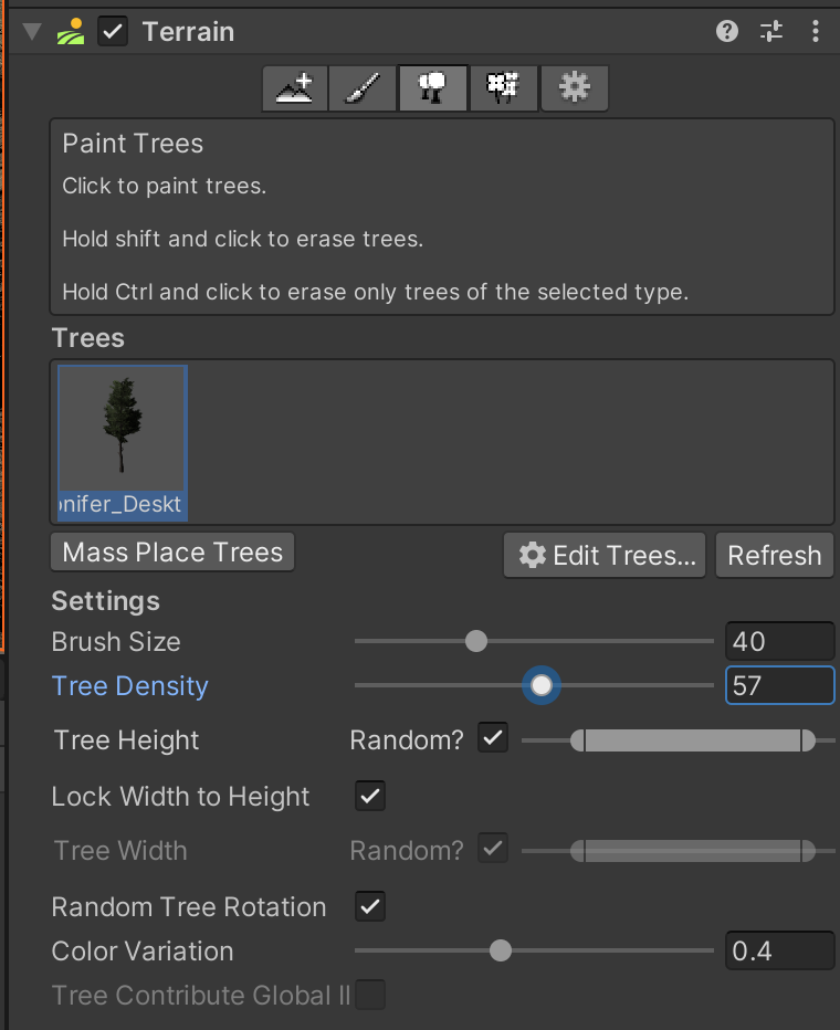 2. Add the Conifer tree prefab to the trees tool in the Terrain window