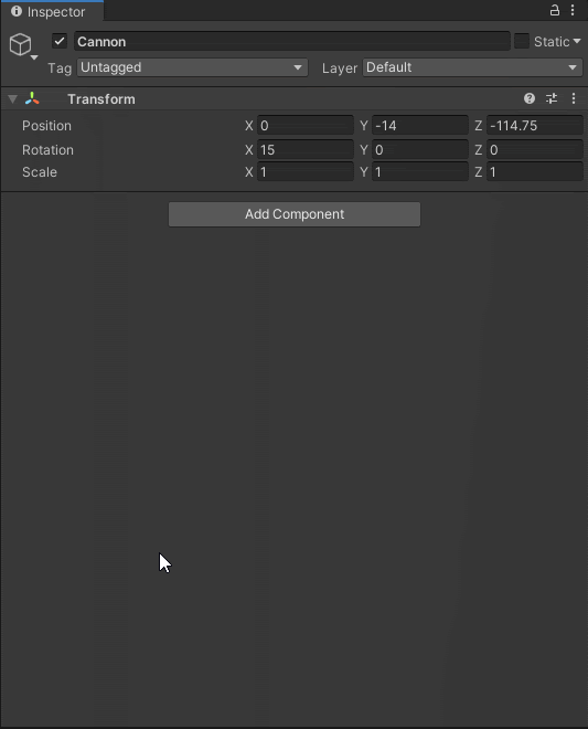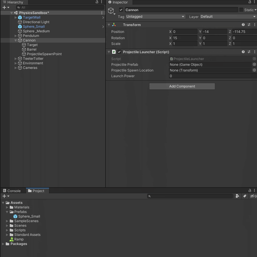 4. Back in the Unity Editor add the ProjectileLauncher script component to the Cannon GameObject using the Add Component button.