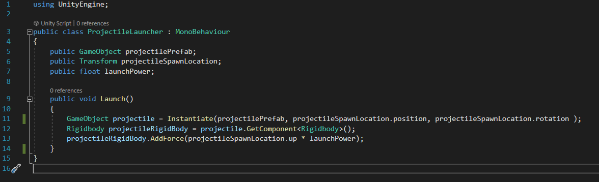 1. Right click in the Project Window, click create, and select C# Script. Name the Script “ProjectileLauncher”.