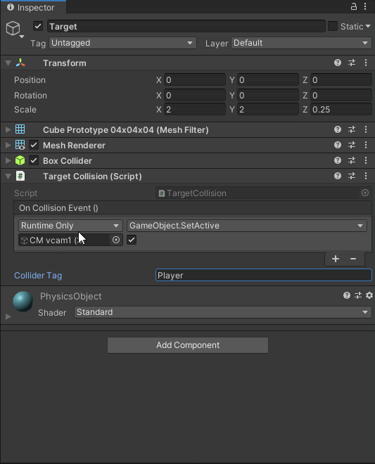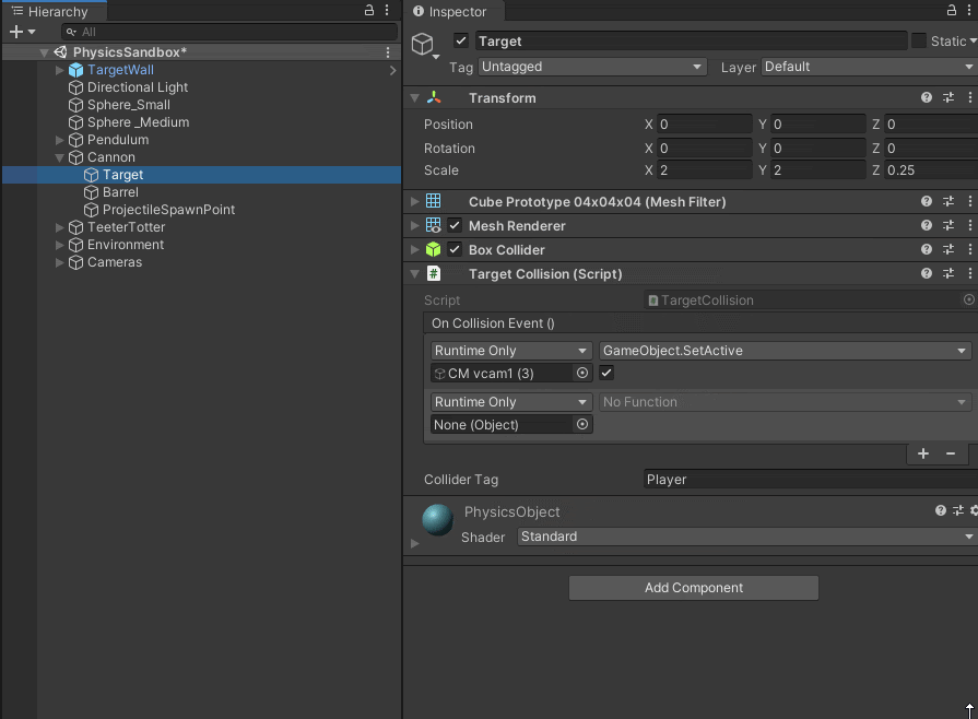 9. To trigger the Launch method, select the target object (Cannon > Target) and in the Target Collision component, click the + button to a new event.