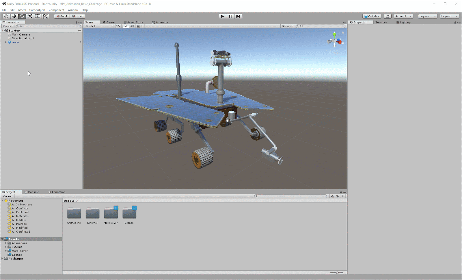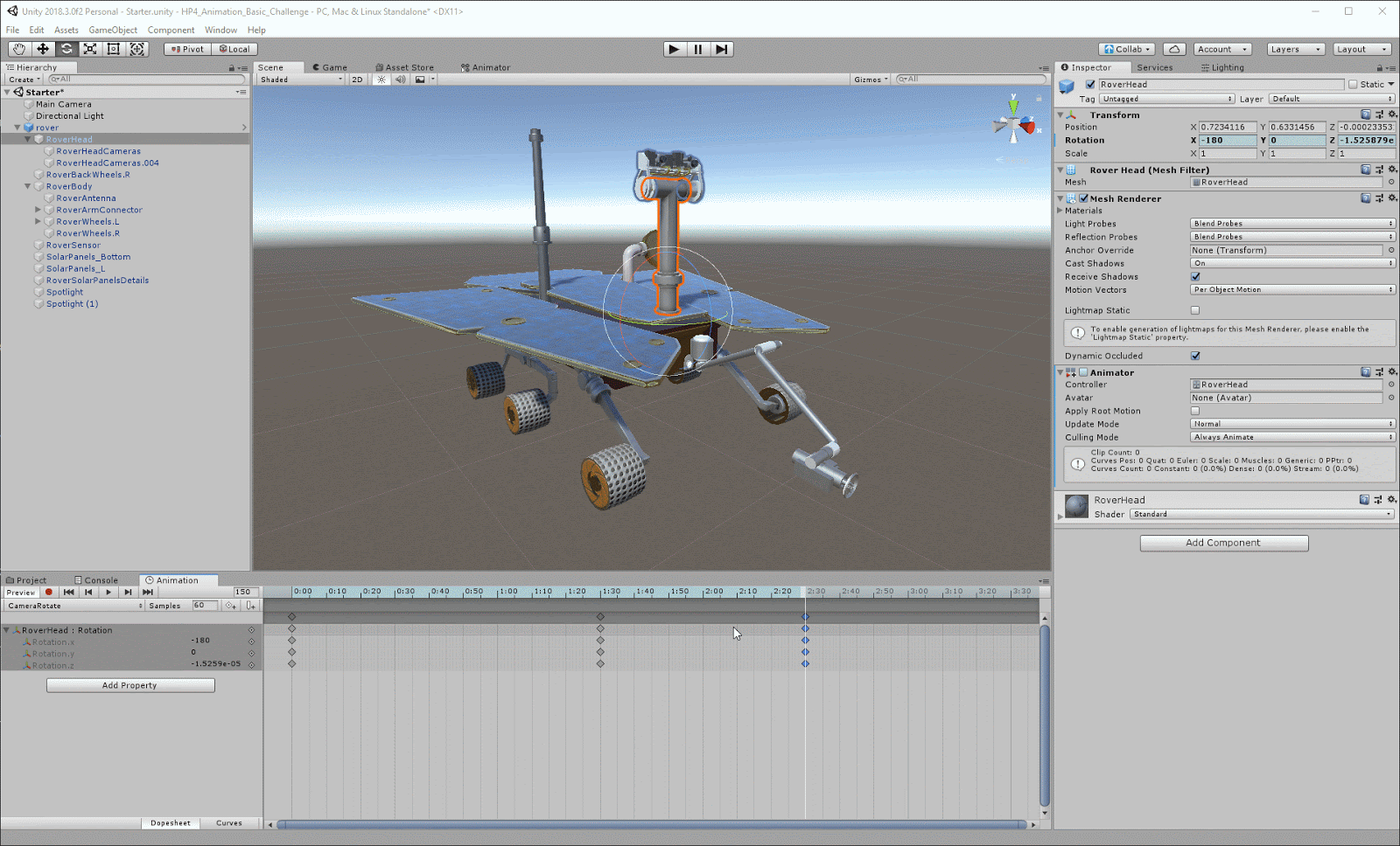 In this challenge, you will animate Cameras on the Mars Rover using Animation Clips. This gives you a chance the practice the skills covered in the previous tutorial.