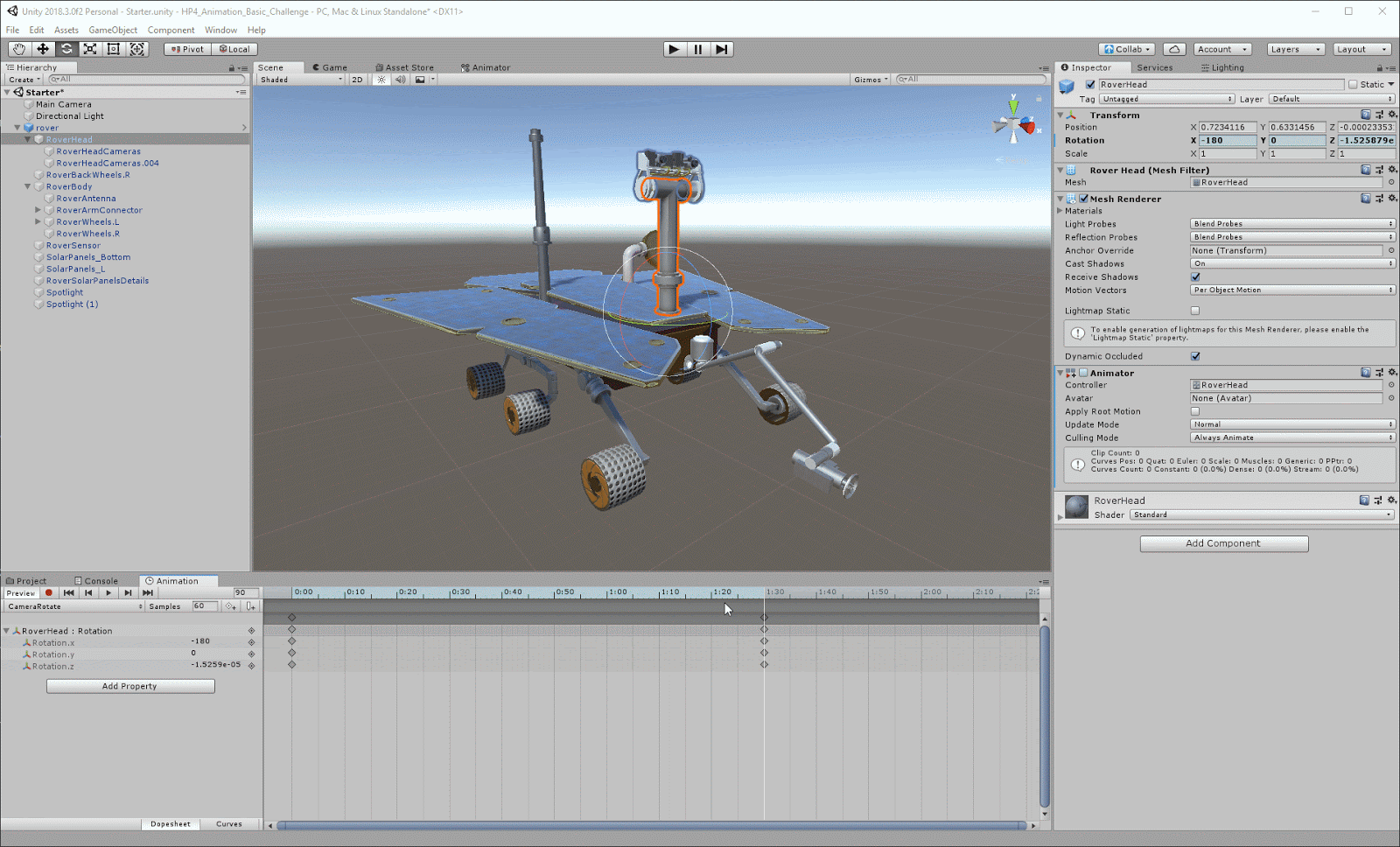 (Hint: RoverHead is a child of Rover. Make sure to expand GameObjects in your Hierarchy (Alt + Click) to see all the parts.)