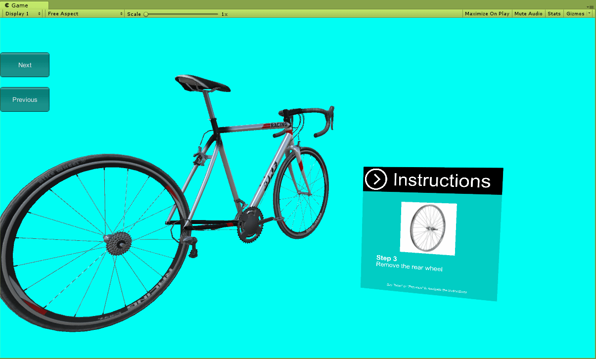 Create an Instructional Step GameObject, toggle the correct UI on, and create an animation that shows the rear wheel being removed to create the third Instructional Step, demonstrating the removal of the Rear wheel.