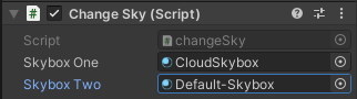 13. Inspector で、追加されたスクリプトコンポーネントで Skybox One スロットに CloudSkybox マテリアルを追加し、その横にあるラジオボタンを選択して、該当する空を選択します (画像 10)。