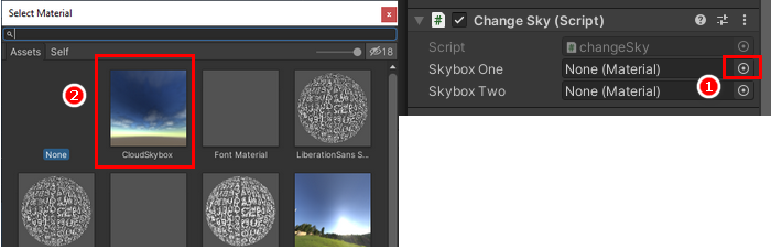 15. プロジェクトを実行します。SkyChangeButton をクリックすると、Material スロットに追加された 2 つのスカイボックスが切り替わります (画像 12)。これらのスロットのマテリアルを、お好きなスカイボックスに変更することができます。