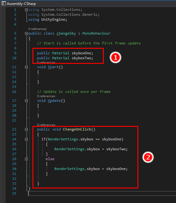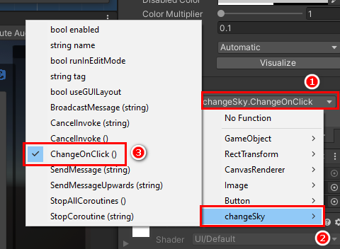 12. changeSky を選択します。スクリプト内の On Click () 関数を変更します (画像 9)。
