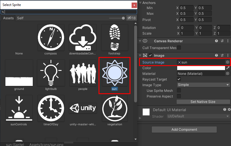 6. SkyChangeButton 要素が選択されたままの状態で、Source Image を Sun に変更します (画像 03)。