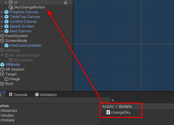 9. Assets > Scripts フォルダーにある changeSky スクリプトを、新しい SkyChangeButton 要素にドラッグします (画像 06)。