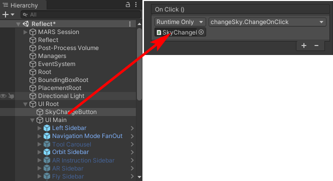 11. SkyChangeButton 要素を Inspector の新しい On Click() イベントにドラッグします (画像 08)。