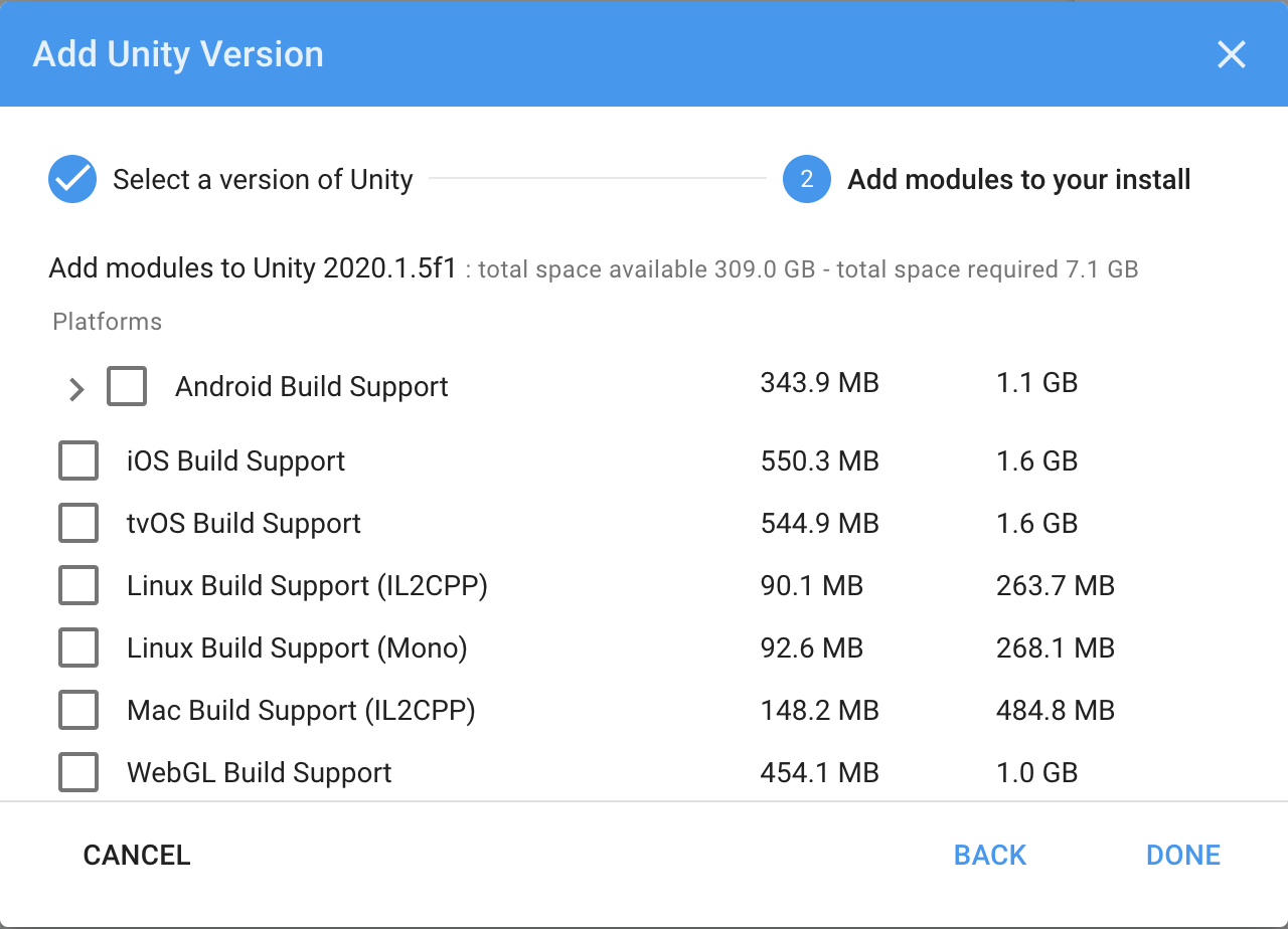 4. Select WebGL (to build projects playable in a web browser) and the Build Support option for your current platform (Linux, Mac or Windows). You can also select additional modules, which can add other features to Unity including: