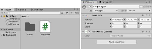 En este tutorial, crearás un componente simple «Hello World» y lo agregarás a un GameObject. Verás cómo puedes usar los scripts para manipular lo que aparece en la ventana Inspector para cualquier GameObject. En el proceso, aprenderás sobre las herramientas y ventanas que se usan para programar en Unity.