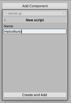 5. Habitualmente la primera lección de creación de scripts en un entorno nuevo es el ejercicio «Hello World!», que es lo que haremos con este nuevo script. Asígnale el nombre «HelloWorld» al script nuevo y selecciona el botón Create and Add (Crear y agregar).