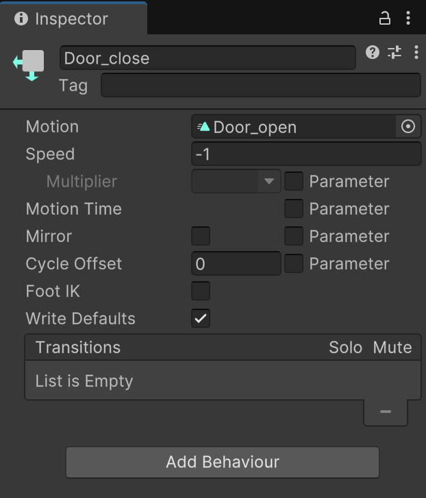 Como puedes ver arriba, tan pronto como la puerta se abre, debe pasar inmediatamente al estado «abierta». La forma en que animaste la puerta ya lo explica. La animación termina con la puerta abierta y con el bucle de la animación desactivado, permanece inactiva en el fotograma clave final. Esto significa que el siguiente paso para la Máquina de estado es crear el estado de la puerta «cerrando». En lugar de crear una nueva animación, puedes reutilizar Door_Open y solo revertirla.