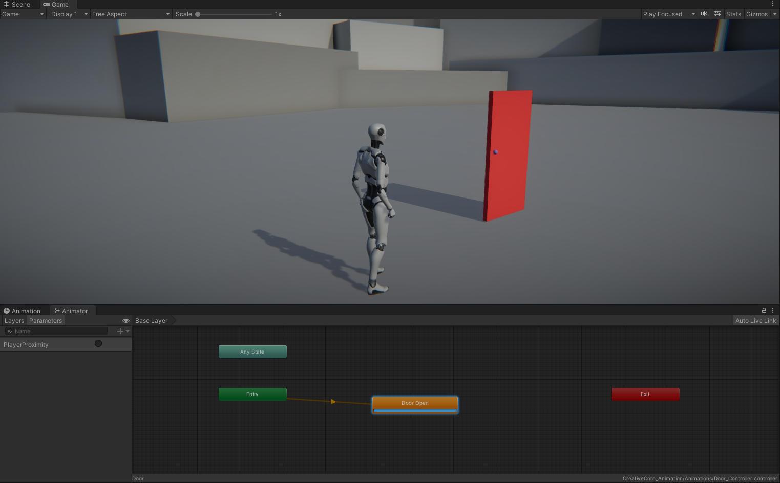 6. Reproduce la Escena y prueba la Máquina de estado. La puerta debe abrirse inmediatamente cada vez que presiones PlayerProximity.