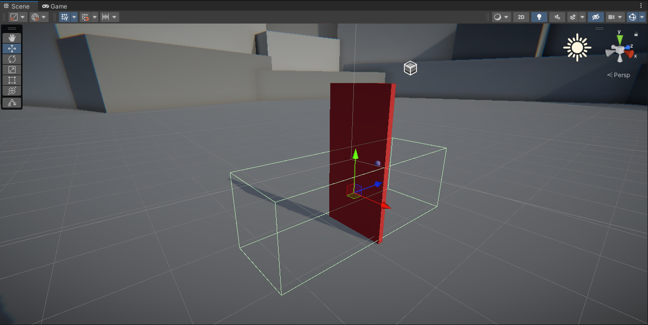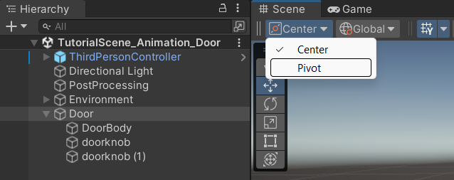 3. Selecciona la puerta. Cuando se selecciona, el widget de movimiento debe aparecer en el borde de la puerta. Si aparece en el centro, selecciona el botón Toggle Tool Handle Position (Alternar posición del control de la herramienta) en la parte superior del Editor, sobre la Hierarchy, para cambiar el valor de selección de Center (Centro) a Pivot o Pivote.