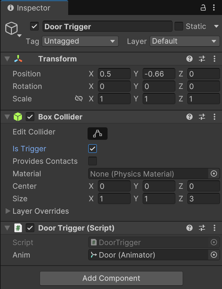 Importante: Asegúrate de que el objeto Door Trigger no sea un hijo del objeto Door, ya que, de ser así, el disparador (trigger) de la puerta se moverá junto con la puerta al abrirse.