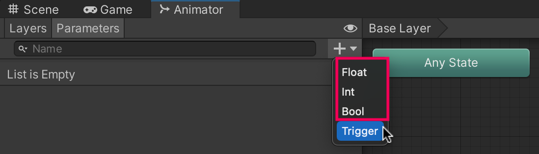 En la pestaña Parameters, selecciona el botón Add (+) para ver los diferentes tipos de parámetros. Los tipos Float, Int y Bool están destacados a continuación.