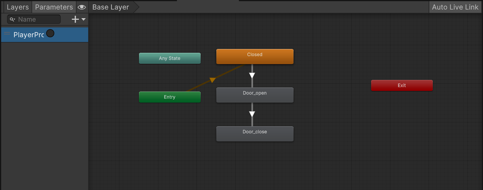 Ahora, cuando presiones PlayerProximity para cerrar la puerta, se reproducirá la animación Door_Close y pasará automáticamente a Exit, para luego regresar al estado Closed. Es posible que hayas notado que a veces hay un pequeño retraso entre el momento en que presionas PlayerProximity y el momento en que se abre la puerta. Esto se debe a que, de forma predeterminada, un nodo de estado completará su tiempo de reproducción activo (representado por la barra de progreso) antes de realizar una transición. Esto se puede desactivar para que la transición al estado Door_Open sea inmediata.
